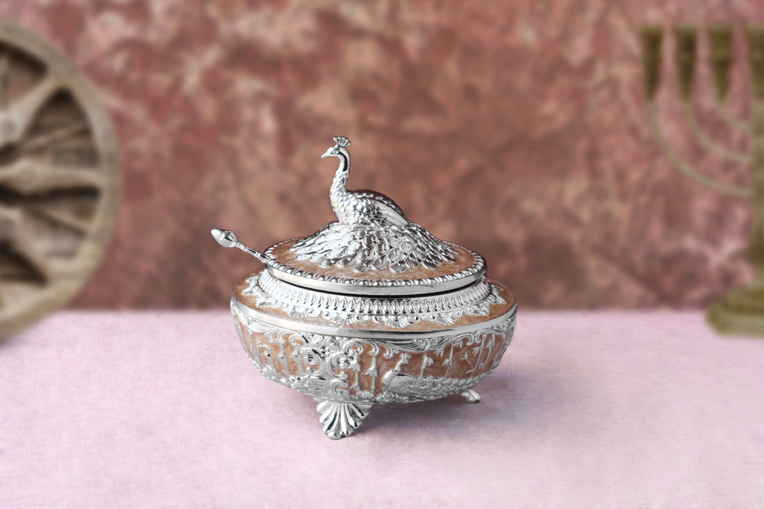 Elevate your dining experience with this exquisite Peacock-Shaped Silver-Coated Enamel Sugar Pot. Designed to reflect...