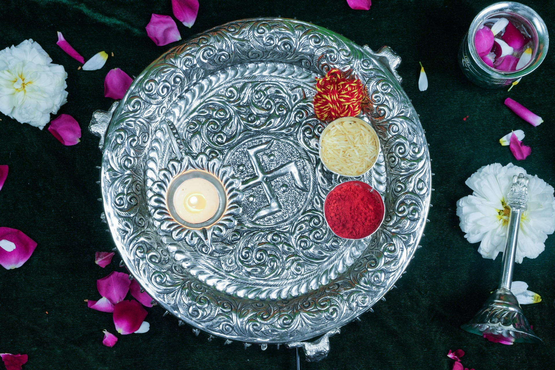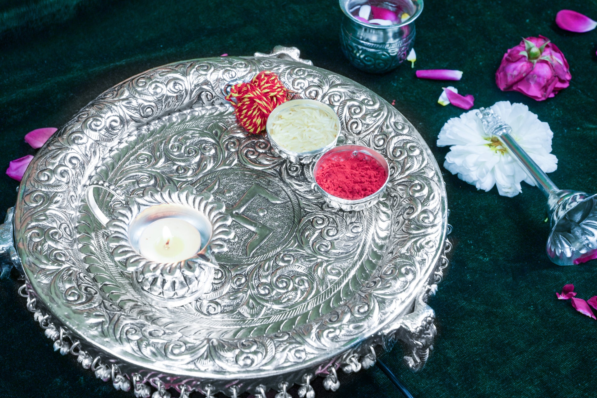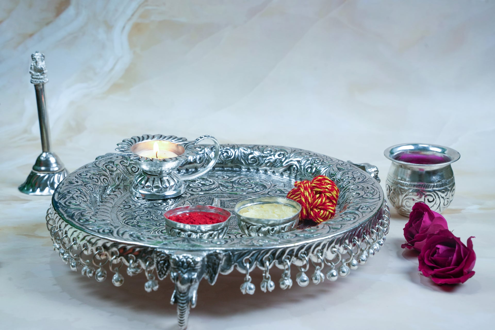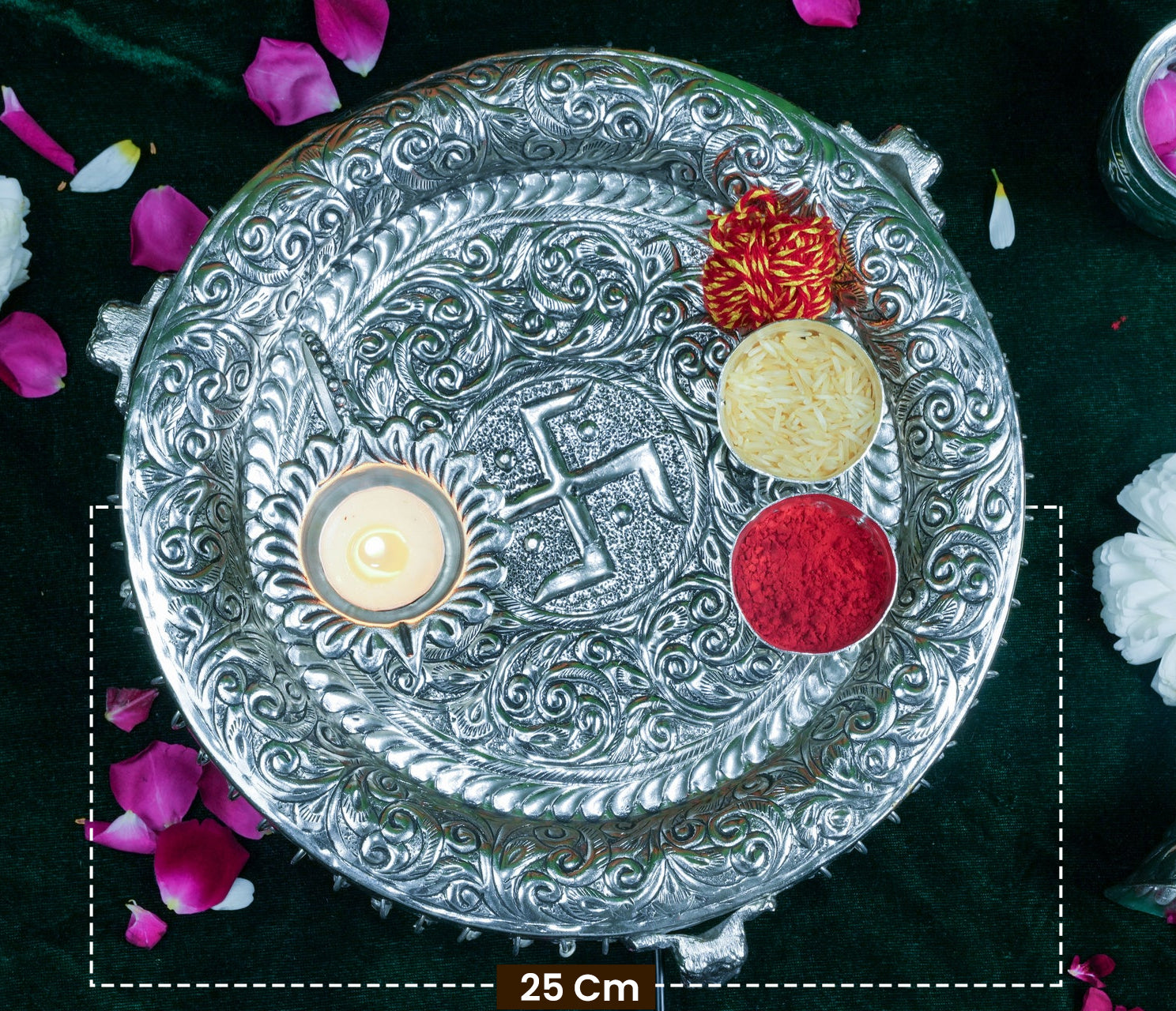 Designed to hold essential pooja items like diya, kumkum, rice, flowers, and incense, the silver-plated finish adds a divine and luxurious touch, enhancing the spiritual ambiance. Ideal for daily worship, festive occasions, and gifting, this pooja thali brings purity and auspiciousness to any ritual.